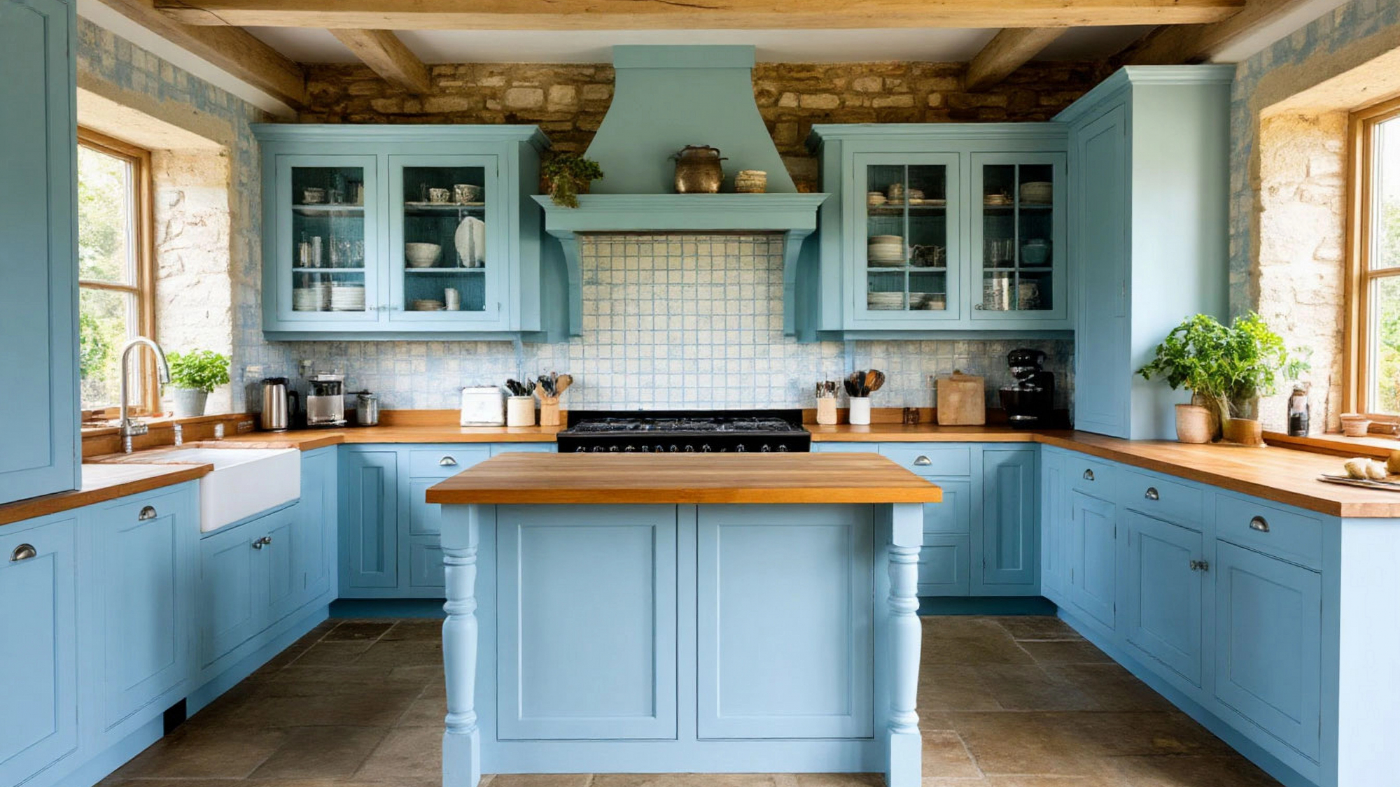 Фасады кухни выполнены в голубом цвете с мягким матовым покрытием, приятным на ощупь. В сочетании с открытыми деревянными полками и тёплым светом они создают впечатление прозрачного воздуха и природной гармонии. Встроенная техника аккуратно интегрируется в общий дизайн, не нарушая цельности образа. Всё выглядит легко, естественно, без перегрузки — и в этом заключается подлинное искусство кантри.