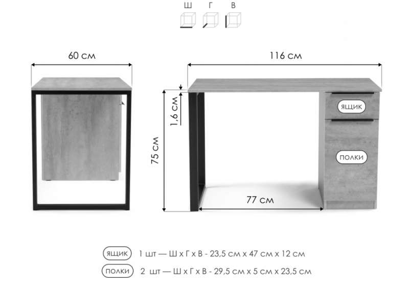 Компьютерный стол Бэтти Лофт 116х60х75 бетон / черный (60x75).